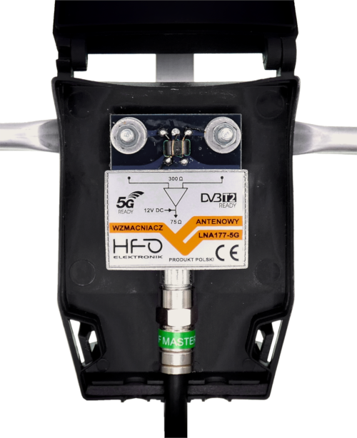 Wzmacniacz LNA-177 (z filtrem LTE 5G), zasilacz, złącze F nakręcane oraz obejmy służące do montażu anteny do pionowej rurki.